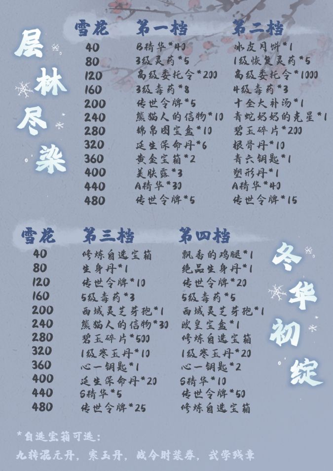 ■活动内容:活动期间,少侠通过完成日常活动可以获得活跃值【雪花】,收集的【雪花】到达指定数量可以领取各类奖励。