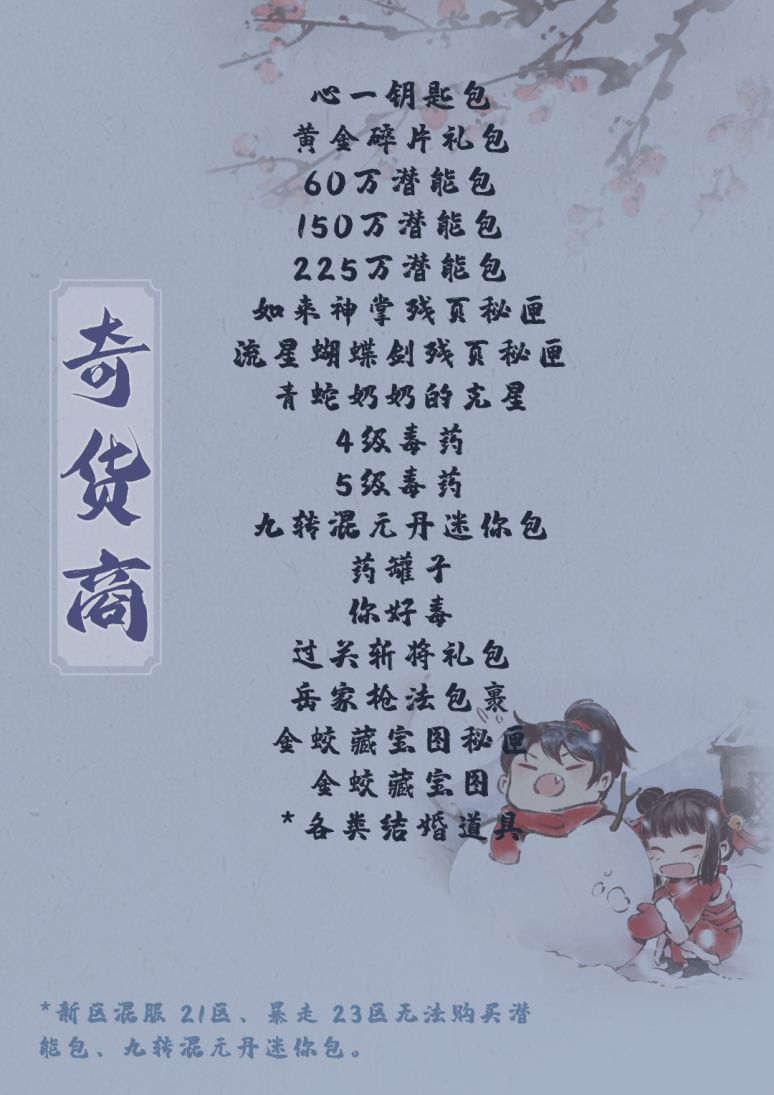 奇货商处引进了不少好东西,有需要的少侠可前往购买。(新区混服21区、暴走23区无法购买潜能包、九转混元丹迷你包)