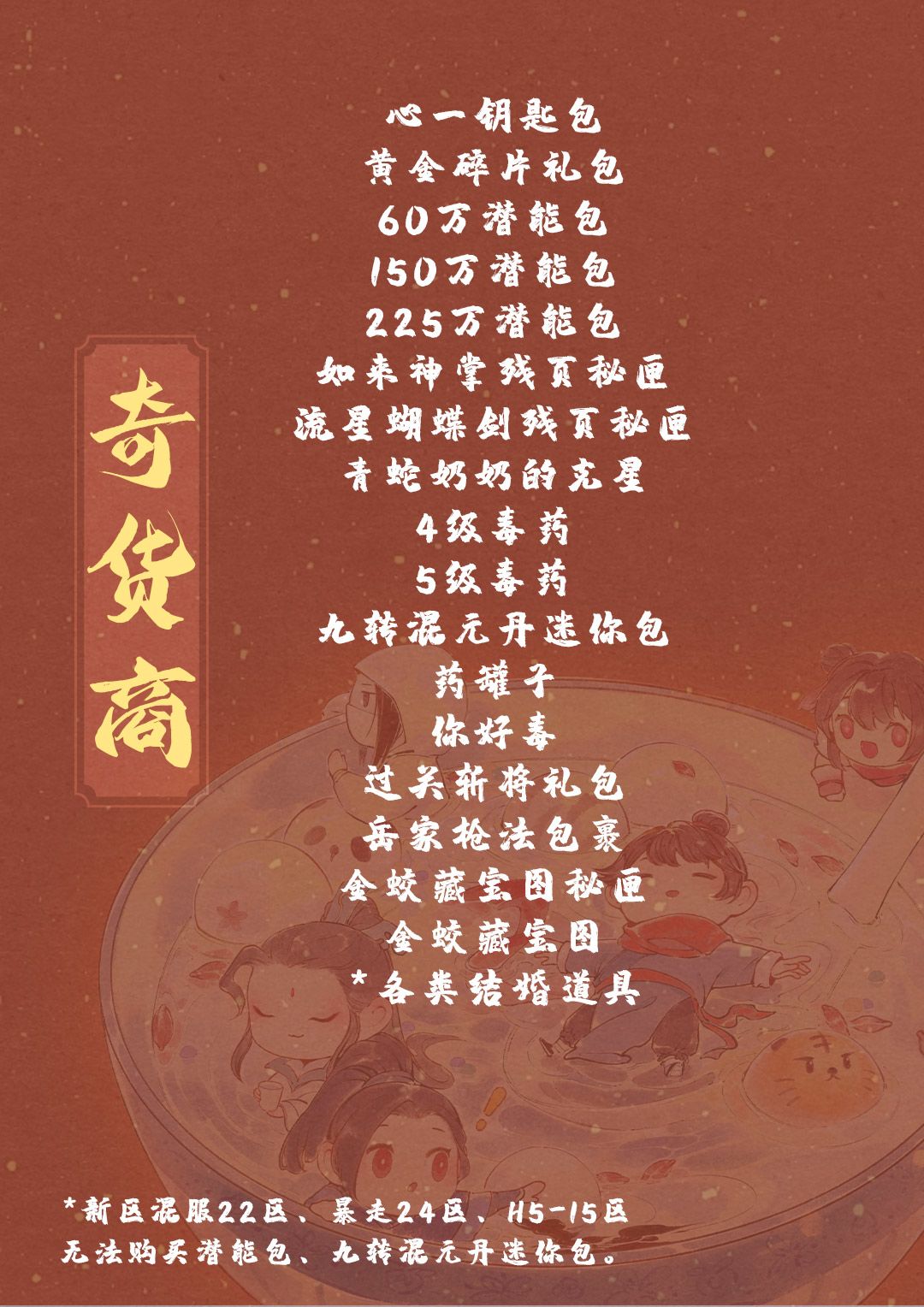 奇货商处引进了不少好东西,有需要的少侠可前往购买。(新区混服22区、混服23区、暴走24区、暴走25区、H5_15区无法购买潜能包、九转混元丹迷你包)