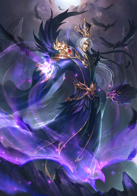 紫色代表的是神秘,整个画面采用了暗紫色做为主基调!汲魂魔鸦司马懿一身紫色长袍,肩胛与腰带还镶嵌着魔鸦的长羽毛!神秘却又透露这一股诡秘的气息!随风飘起的银发及嘴角的一抹邪笑,显示着他在战场中十足的自信!他手握魔鸦羽扇,张开双臂,手掌施法,魔鸦的法术幻影变飞向敌人身上!