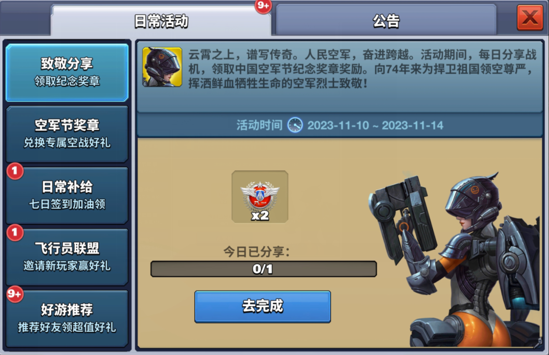 大国重器,利刃出击!与好友分享战机或机群,邀请好友加入游戏共同书写空战传奇!每日分享战机,赢取[2023中国空军节奖章]