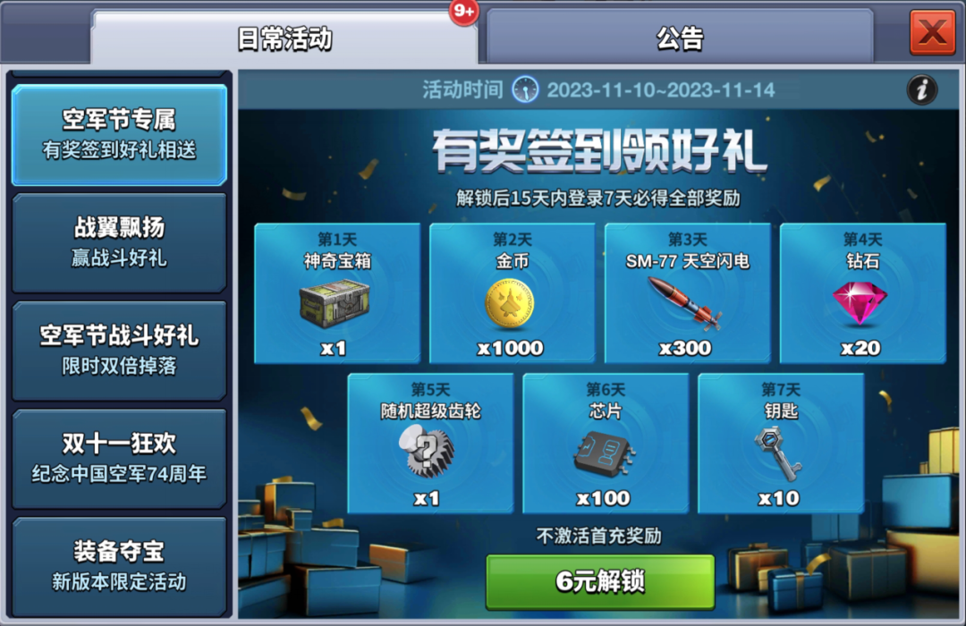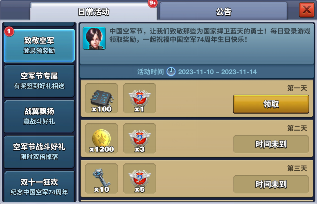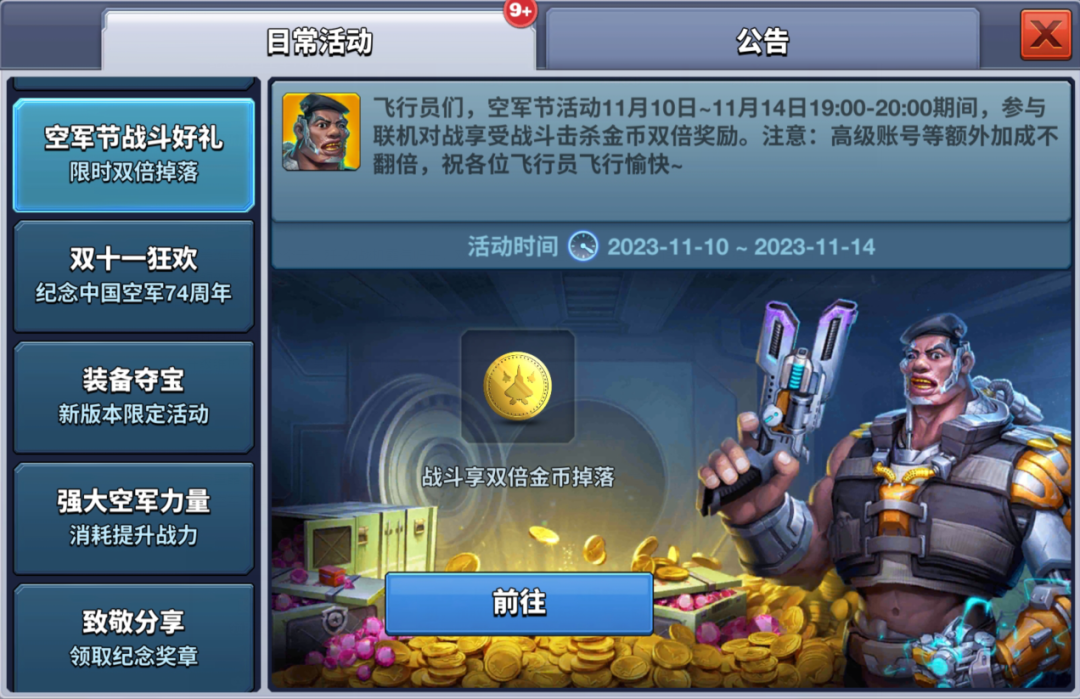 飞行员们,空军节活动11月10日11月14日 19:00-20:00期间,参与联机对战或级别挑战赛享受战斗双倍奖励。注意:高级账号等额外加成不翻倍,祝各位飞行员飞行愉快