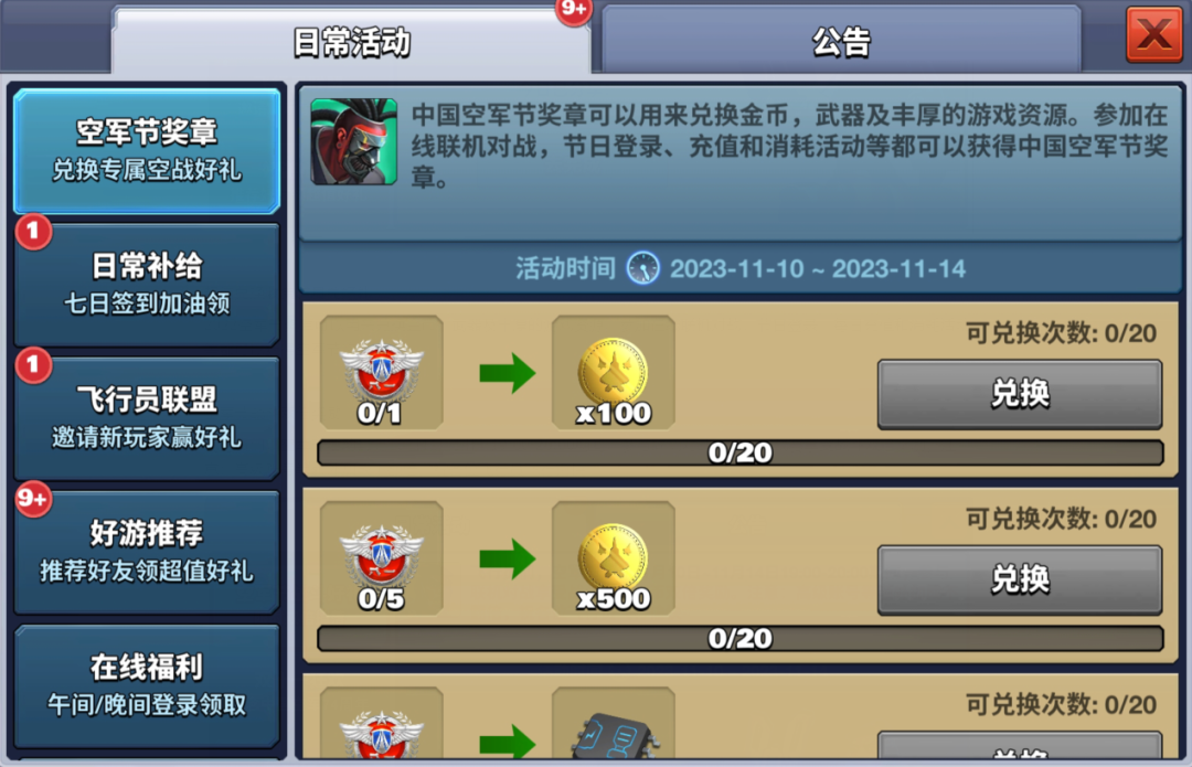 2023空军节奖章可以用来兑换金币,武器及丰厚的游戏资源。参加在线联机对战,节日登录,每日充值和消耗活动等都可以获得空军节奖章。