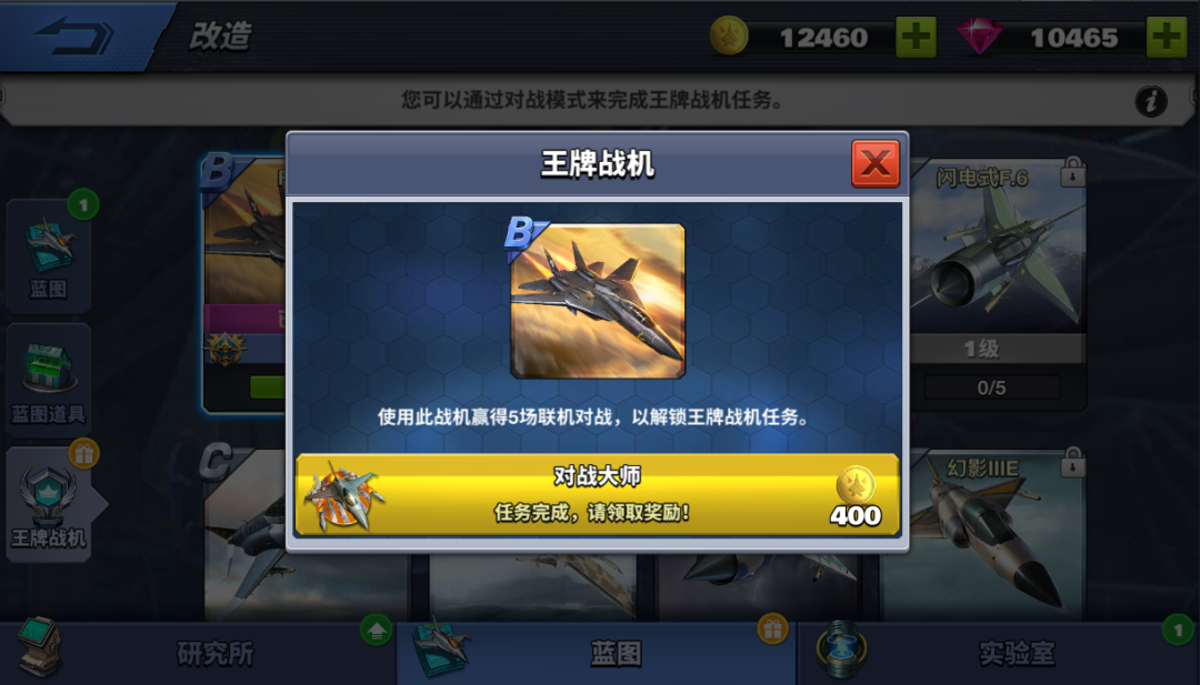 若想解锁飞机的王牌战机任务,飞行员们需要先升级战机蓝图等级。然后,当你赢得5场联机对战胜利后,就可以领取奖励并解锁此飞机的王牌战机任务了。
