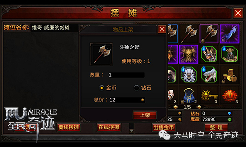 下面简单介绍一下《全民奇迹》的摆摊系统,此系统分为两类,一是在线摆摊,玩家可以在主城内,选择一块宝地,在界面中选择摆摊按钮,然后将所要买卖的物品放入出售格中,打入价格,并用一句吸引人的标语(摊位名称),引来游戏中其他玩家前来选购。