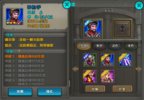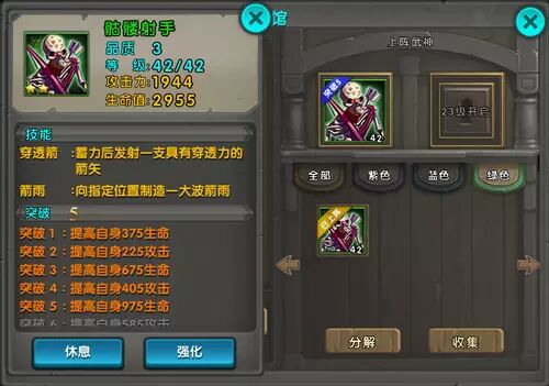 绿色武神骷髅射手是屌丝和0元党的春天,突破容易,输出足够亮眼。这个阶段,骷髅弓的攻击比主角还要更高,重点推荐。