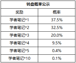 1、活动期间内,玩家可消耗钻石在转盘中抽取随机数量的“学者笔记”(单次抽取消耗250钻石);